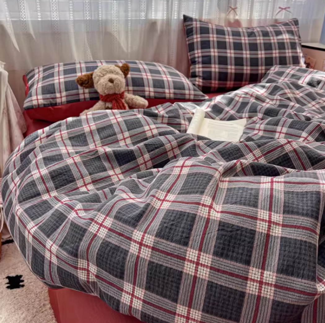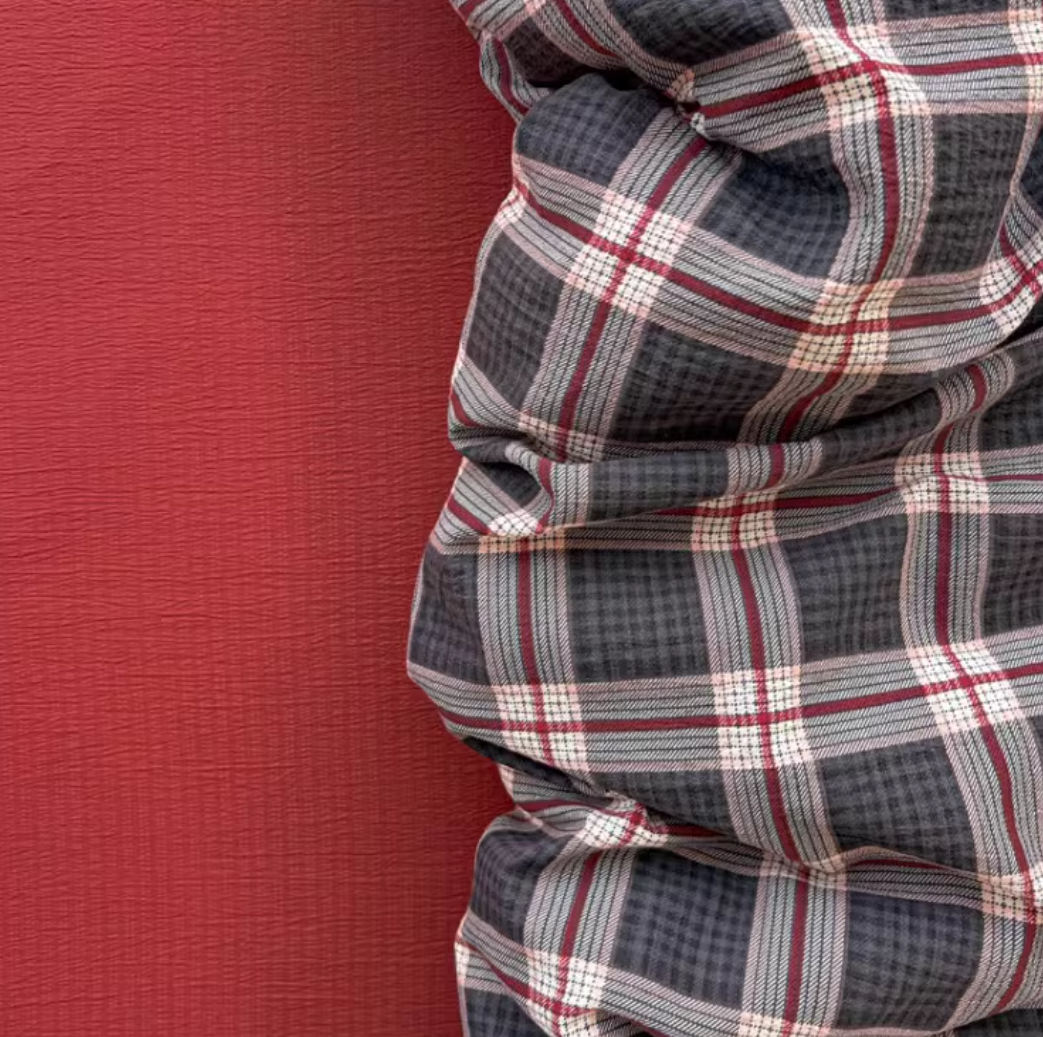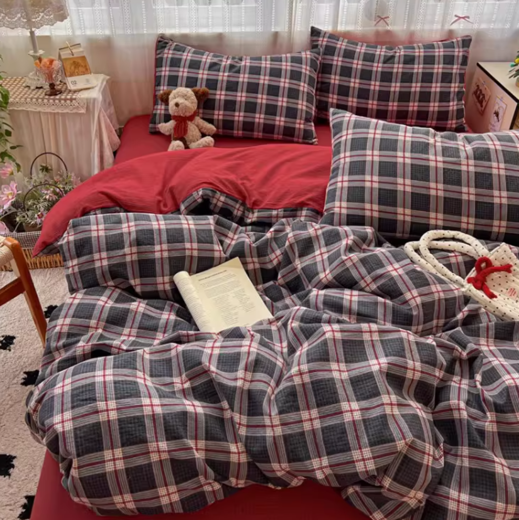 Tone caro đỏ — đen ấm áp, mềm mịn mát da. Chất liệu tự nhiên 100%, an toàn cho cả da nhạy cảm. May vỏ ga theo đúng size giường của bạn.